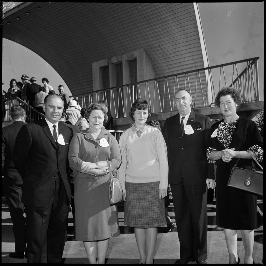 This image was not published in the Manawatu Evening Standard, taken on 8 May, 1963. [Two men and three women stand in front of a building and crowd of people going up steps. Three of them wear badges.] "