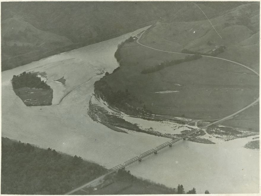 Photograph shows Manawatu River in flood at Ashhurst Bridge.