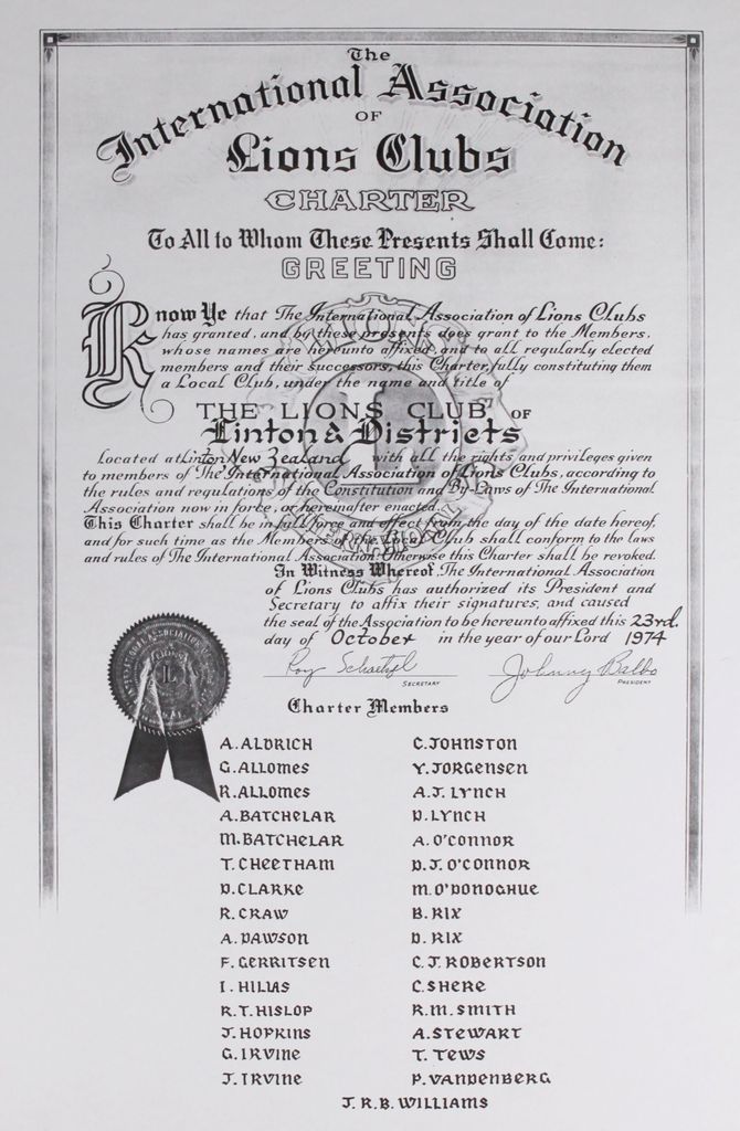International Association of Lions Clubs Charter, granted to the The Lions Club of Linton & Districts on 23 October 1974. Lists Charter members of the Club. Scanned from photocopy. Part of the Linton and Districts Lions Club Archive.