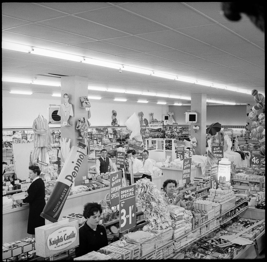 This image was taken for a story that ran in The Manawatu Evening Standard on 19 October 1960 "The interior of the new Woolworths (N.Z.) Ltd., store is designed to show to advantage the huge stock of merchandise. This photograph shows a section of the new store as the customer will see it when it opens tomorrow."