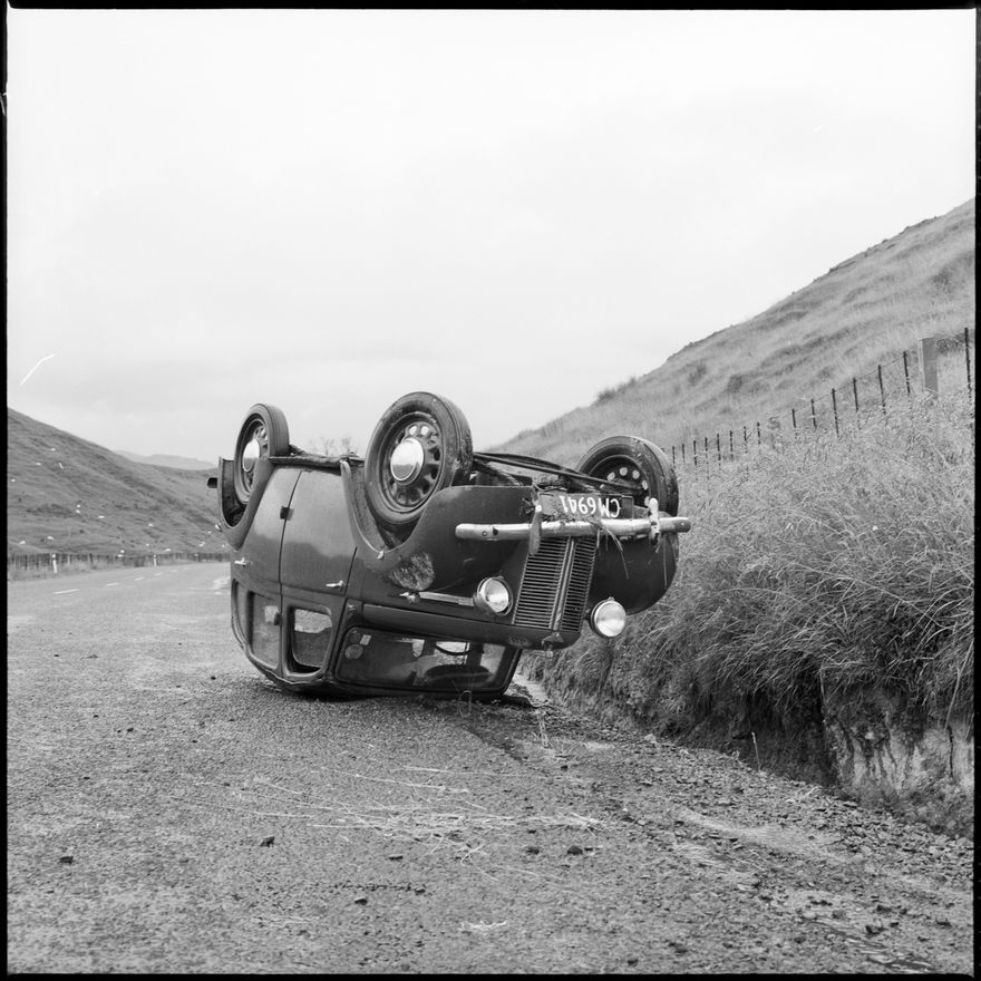 [Image of a Ford Prefect car turned upside down, on a country road.]