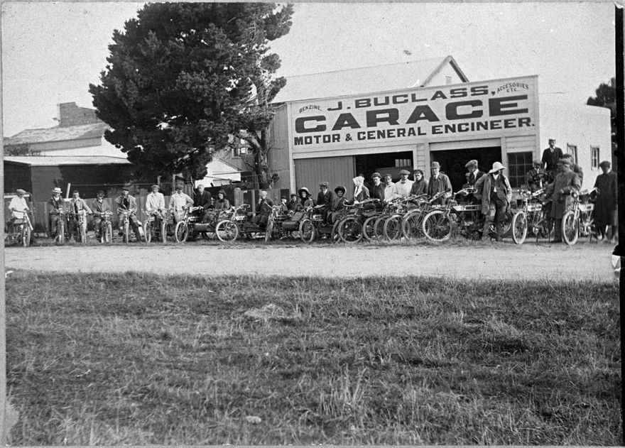 The Palmerston North Motorcycle Club gather outside J Buglass Garage, ready to run out to Foxton Heads.