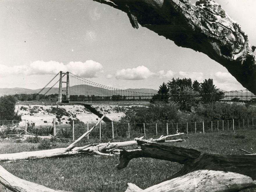 The old Opiki toll bridge photographed from the west bank looking eastward towards Palmerston North. It runs across the Manawatu River at Opiki and was constructed by the Tane Hemp Company in 1917-1918 (engineer Joseph Dawson, Pahiatua). It was known for many years as the Opiki Toll Bridge or the Opiki Suspension Bridge. It closed in 1969 but can still be seen today (2014).