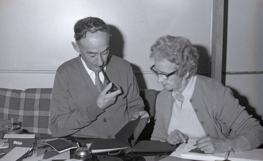 "Mr and Mrs G. A. James looking over a new range of suit patterns in their new shop."