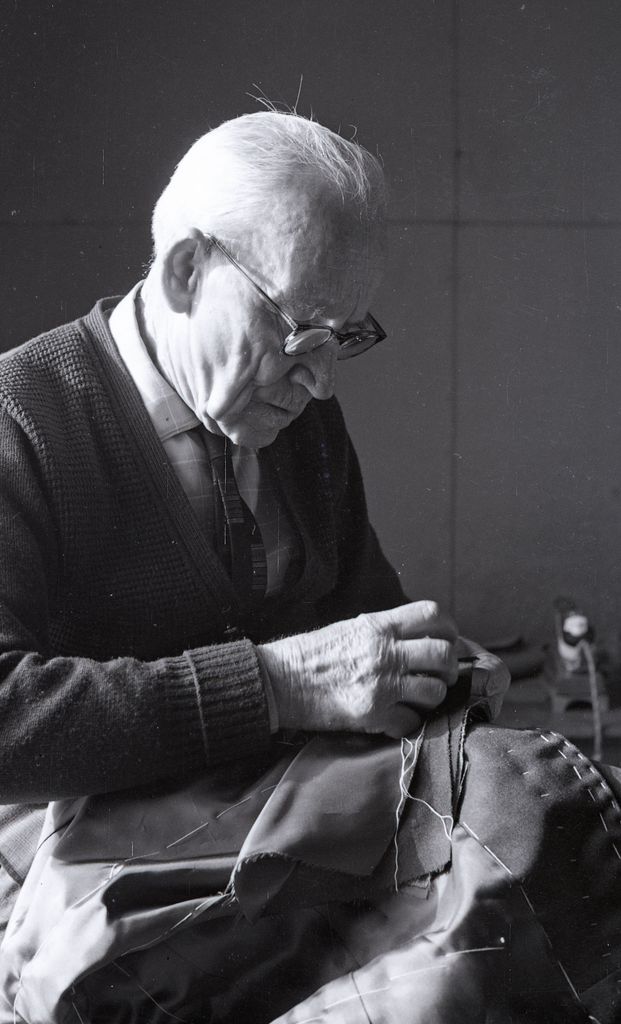 "Mr J. McShane, 73 years-of-age, believed to be the oldest working tailor in N. Z. in the process of hand sewing a coat."