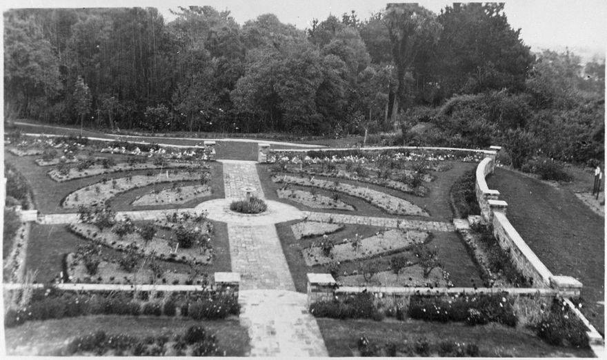 'Atawhai', meaning 'warm welcome', was built for Edwin Keiller, a widower, as a healthy place to raise his children. It was designed by C.T. Natusch, the architect, and built by Arthur Bennett at the top of the bluff across the bridge from Palmerston North. At the time building materials had to be hauled up the bluff by a double pulley, although a steep access road was built at a later date. The house had 17 rooms, plus sculleries and pantries, and included a veranda facing the sun. In 1963 the Presbyterian Educational Trust bought the house and it is administered in conjunction with Massey University as a hostel for students. It is now known as Fergusson Hall. The photograph shows the completed rose garden.