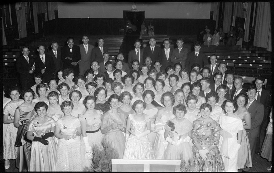 This image was taken for a story that ran in The Manawatu Evening Standard on 11 December 1958: "This happy group from the Palmerston North Teachers' College received their diplomas last evening. It was the first time such a ceremony has taken place at the college. Eighty-two persons received their diplomas."